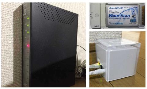 リビングに@niftyのADSLアダプタ NEC Aterm WD701CV(C)が置いてあって(下図左)、これに内蔵出来る無線LAN親機 NEC Aterm WL54AG WARPSTAR(下図右上)を使うか、au契約してた時にタダでもらったHOME SPOT Cube (Planex Communications、下図右下)をアクセスポイントにして、WiFiを飛ばしていた。うちはADSLでhulu見てるんだ。大体つながるのは上の色をつけた範囲で、トイレはつながったり切れたり。