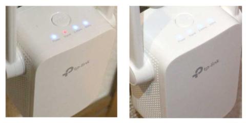 電波が届かないスポットに「中継器」を設置すると、下の左のように左から2番目のシグナルLEDが赤く光って、例え右の二つのLED(2.4GHzと5GHzの接続)が青くてもインターネットにはつながらない。下図右側のようにシグナルLEDが青く光るのは家の中では上の見取り図の中の青2箇所、コンセント1・2だけだ。