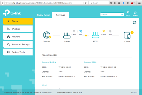 因みに、RE305の設定エミュレータがTP-Linkのホームページに用意されているので、実際どのような設定操作を行うのか購入前に体験することができる。