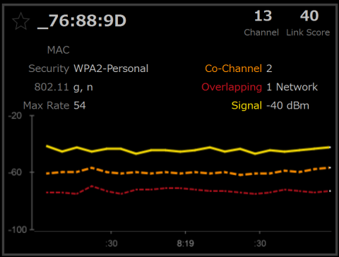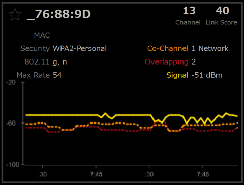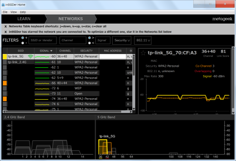 左上のWiFiスキャンペインには飛び交っているWiFiのSSIDとMacアドレス、使用チャンネル、暗号化が表示される。下段の2つのペインには2.4GHz帯と5GHz帯それぞれ競合する電波の強度がチャンネル毎に表示され、現在ログインしているSSIDは強調表示されている(ここではオレンジ)。右上のペインには横時間軸でリアルタイムに現在ログインしているSSIDのシグナル強度とチャンネルを共有するSSIDのシグナル強度が表示される。部屋を移動するとリアルタイムにシグナル強度の変化を見ることが出来る。右上に示されるLink Scoreが高いほど良い。