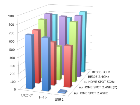 上り、アップロードに関しては、ダウンロードのような大きな差は見られないが、部屋2からau HOME SPOTの2.4GHzが見えたり見えなかったりという不安定さがRE305では無くなっている。