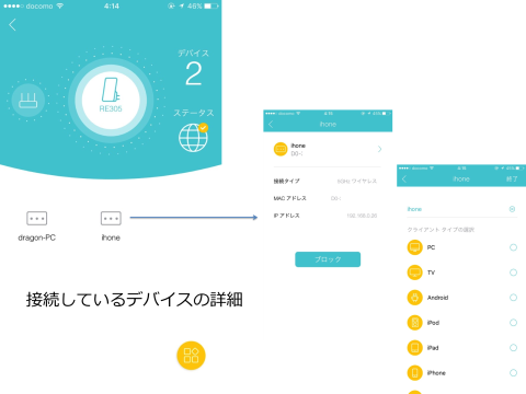 ホーム画面が表示される。RE305に接続されているデバイスが表示されるので、それぞれクリックすると詳細が表示される。デバイスタイプは流石に自動認識しないので、自分でPCとかiPhoneとか設定する。