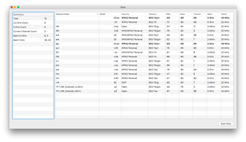アプリを立ち上げ、メニューからWindow>Scanを開き、右下の『Scan Now』ボタンをポチッとな。グラフィカルではないけど、機能的にはInSSIDerと同じ。