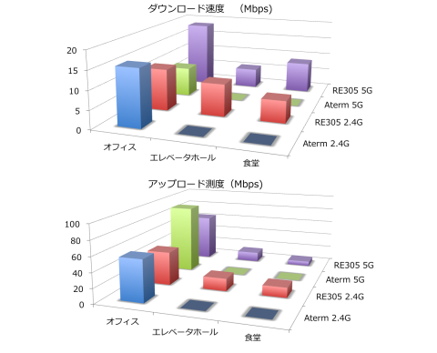 アップロードの方も似た状況で、オフィス内ではAtermとRE305は2.4GHzで50Mbps前後、5GHzで60〜90Mbpsの互角の速度を出している。エレベータホールや食堂に移動すると、Atermはまったくつながらなくなるが、RE305は6〜16Mbpsというそこそこの速度を出してくれる。
