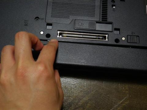 2箇所あるバッテリー固定用のスライドを解除し、バッテリーをゆっくり引き抜きます。