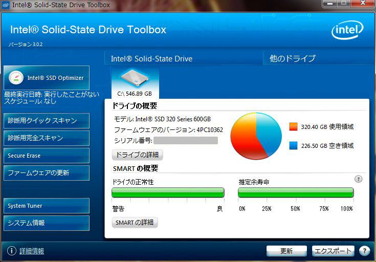標準状態のストレージは、日立製「5K500 B-320」、5400rpmの320GBのSATA HDDです。