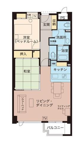 テレビの右側にはローテーブルとソファ。こちらのソファはソファベッドになっていて