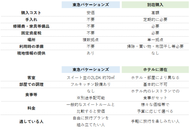 別荘vs東急バケーションズ、ホテルvs東急バケーションズで簡単に比較をまとめてみました。