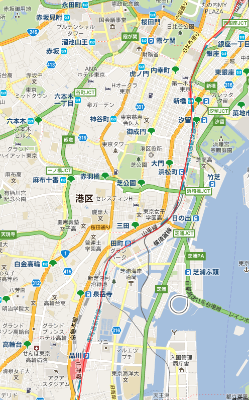 通勤では地下鉄を使うので、駅から駅の間は直線で結ばれています。(紫の線)