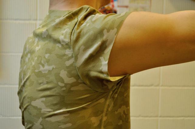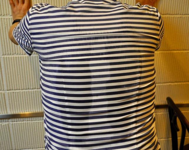 背骨の両脇に汗が染みとして浮かび上がっているのが確認できると思いますが、柄物の下着を着ていることは判りません。