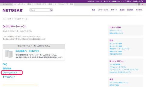 「Orbiサポートページ」へアクセスし「ファームウェア」をクリックします。
