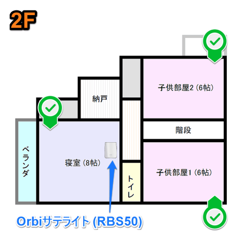 8帖の寝室の廊下寄りに NETGEAR Orbiサテライト (RBS50) を設置。