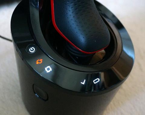 使用方法は簡単。シェーバーを置いて充電コネクタを押して洗浄ボタンを押すだけ。同時に充電もしてくれる。