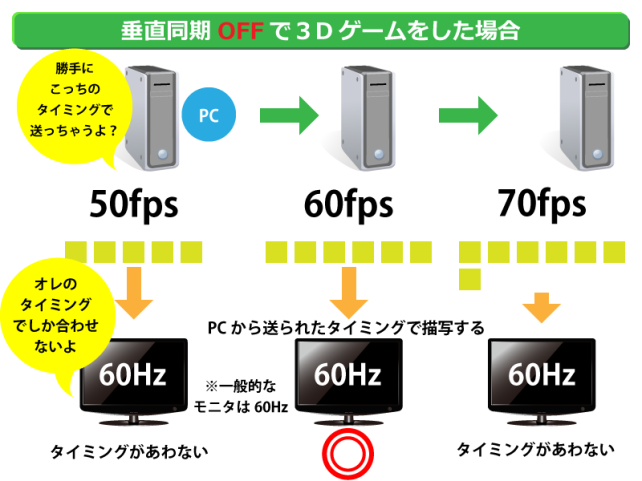 PC(グラボ)側が、モニタへ出力する可変のゲーム描写を、なるべくモニタの一定の更新に合わせて送るよ、、という仕組みが“垂直同期ON”なんです。