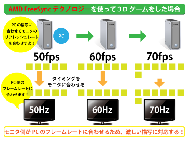 AMD FreeSyncテクノロジー搭載のモニタではモニタ側でPCに合わせてリフレッシュレートが可変するんです。
