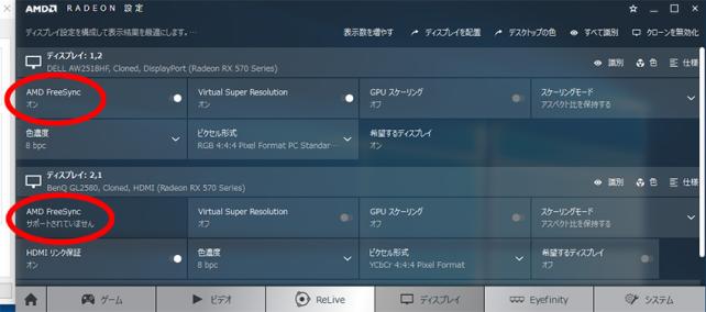 ちなみに、下のモニタはAMD FreeSyncに対応していないので“サポートされていません”と表示されます。