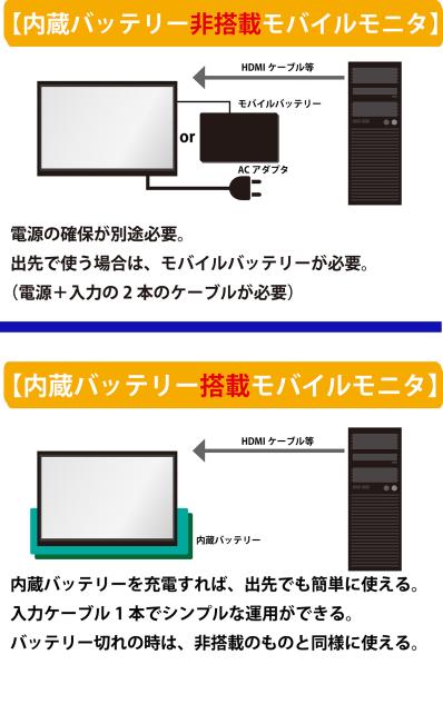 従来のモバイルモニタのバッテリーを外部から持ってこなければならない問題(モバイルバッテリーを別途用意が必要)を解消してくれモバイルのしやすさに感動。