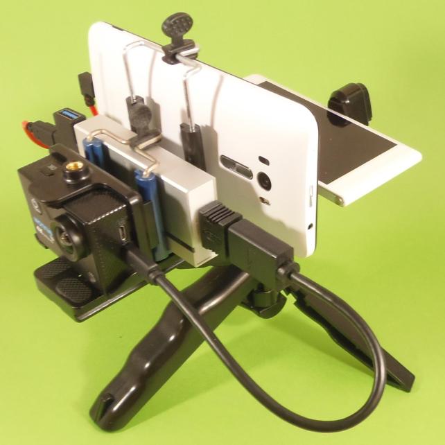 左からカメラ、UB110キャプチャーデバイス、保存と配信スマホ、テザリングスマホ