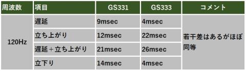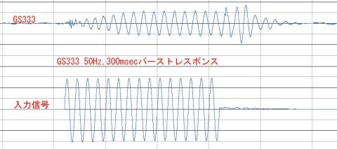 GS333はGS335よりもバースト開始時の遅延が少ないのですが、立ち上がりにやや時間がかかる感じです。GS335は無線接続の影響によるものではないかと思いますが、遅延は大きいです。ただし立ち上がり自体はGS333よりも早いので。振幅が安定するまでにかかるトータルの時間はほぼ変わりありませんでした。