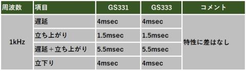 立ち上がりはGS333のほうが早く、バースト終了時の波形の乱れも少ない感じです。