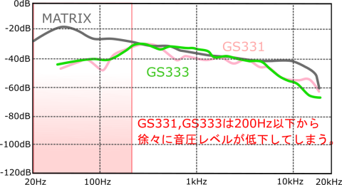 GS331,GS333は80Hzの振幅が小さめで、どこから出力され始めたのかわかりにくいです。