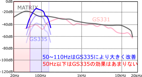GS335を追加するとGS331とGS333の波形はほぼ同じになります。GS335を追加することで、重低音に関してはGS331とGS333の差はほぼなくなるといって良いでしょう。