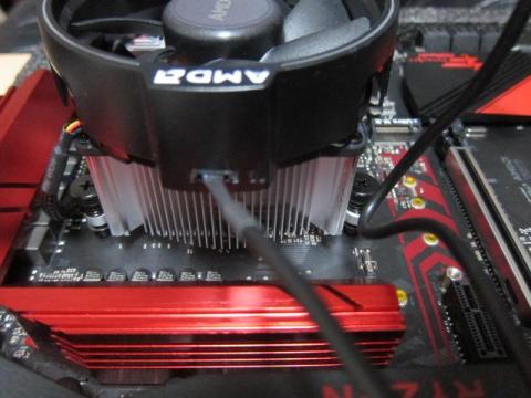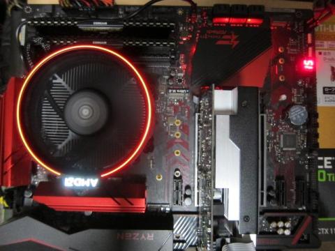 純正Wraith SPIREもマザーボードもRGB LED付きなので,悩ましいところです.バラック状態での確認ですが,こんな感じに,クーラーとX370チップセット周辺が光ります.