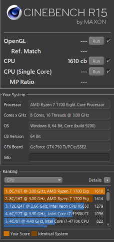 結局,AMD Ryzen Masterユーティリティで,Ryzen™ 7 1700は,3.9GHzまでCINEBENCH実行が可能でした.その時のCPUスコアは,1610でした.これは,最上位モデルのRyzen™ 7 1800X並のスコアです.
