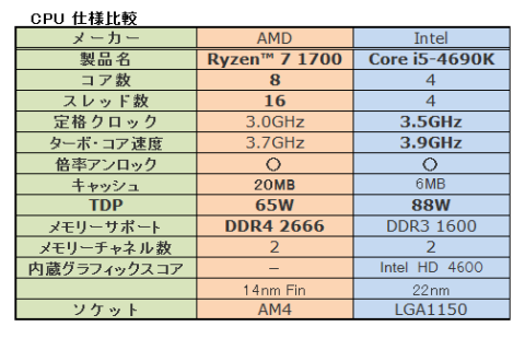 一方,16スレッドが活かされるマルチコアでは,Ryzen™ 7 1700が約2.5倍高速で,圧勝です.最近はマルチスレッド化が図られていますから,一般的な使用においては優位です.