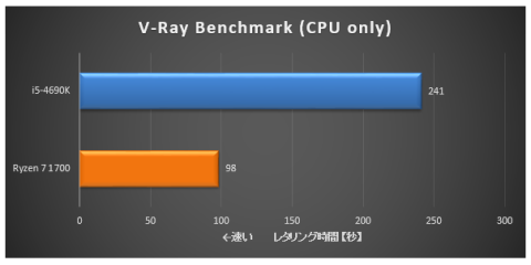 ここでもCPUレンダリング性能は圧倒的な差が出ました.i5-4690Kが4分01秒かっているのに対し,Ryzen™ 7 1700は1分38秒と約2.5倍高速です.この結果は,CINEBENCH R15のマルチCPUのスコア差とほぼ同じで,2.5倍程度のレンダリング性能差があることが再検証されました.
