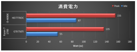 一方,Devil-PCはグラフィックボードが異なりますが,Idle:85W,Peak:155Wと4コアCPUの一般的な消費電力です.