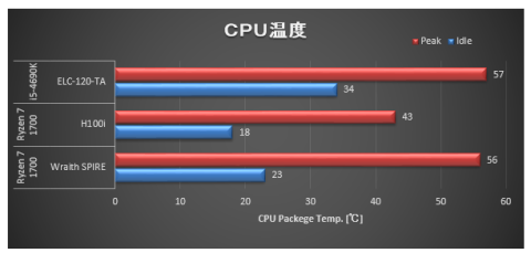 一方,i5-4690Kは,Idel:34℃,Peak:57℃でした.これは,CPUクーラーに簡易水冷(ELC-120-TA)を使用しての温度なので,同じ性能の空冷CPUクーラーの場合,もう少し温度上昇していると考えられます.