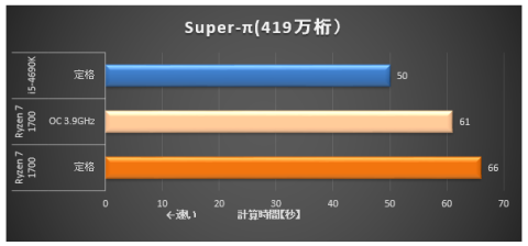 しかし,Super-π(419万桁)を実行すると,Ryzen™ 7 1700の66秒(定格),61秒(3.9GHz)に対し,i5-4690K(定格)は50秒と速いです.Intelコアの基本性能の高さを示しています.