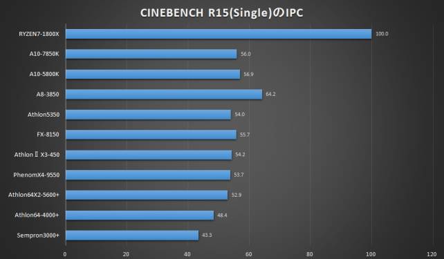 だいCINEBENCHのシングルスレッドの結果を見る限りは、K8アーキテクチャとbulldozerアーキテクチャのIPCはそれほど変わりません。逆に言えばbulldozerでもボトルネックになりにくい並列性の高いベンチと言えるのでしょうか?シングルスレッドでもRyzen™ 7 1800XのIPCが圧倒的に高く、効率の高いアーキテクチャであることをうかがわせます。