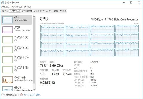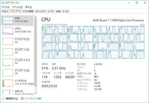 タスクマネージャーのSSは1700X@2.6GHzのものです。