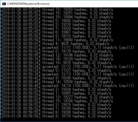 GPUマイニングではなくCPUパワーで仮想通貨を採掘するCPUマイニングを2018年に入って始めたました。1700@3.8GHzで8T動作で他に複数アプリを走らせている状況ではハッシュレートは約4.5k程度です。他のアプリを止めると約5.5k程でているので1K程落ちています。4.5kですとこちらの利用している採掘プールでは1日6~7枚程度ですので1月でおよそ200枚程度となります。