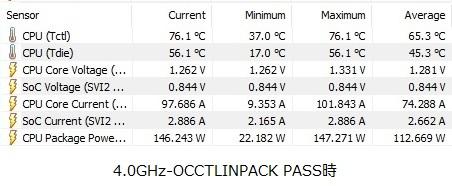 簡易負荷試験は4.0GHzまで通りました。4.0GHzでのBIOS設定電圧は1.325Vです。3.9GHzは1.275Vと1700@3.8GHzで常用している設定の1.2875Vより低い電圧で簡易試験をパスしました。