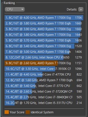 偶然ですが1700@3.8GHzと1700X@3.9GHzで1660という数値がでました。