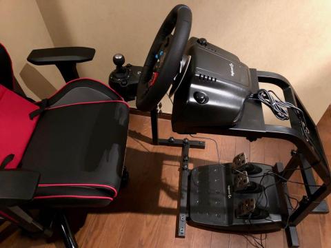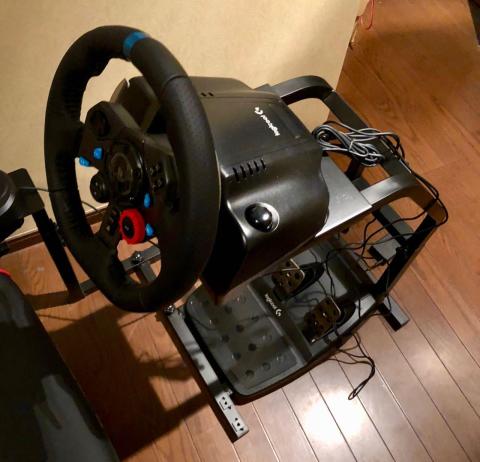 椅子とステアリングを組んでから高さの調整幅の合いそうなスタンドを購入。思った以上に高さが合う製品が難しい。