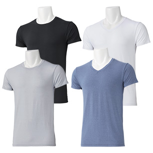 色はシロ、グレー、コン、クロの4種類。丸首半袖シャツと、V首半袖シャツがあります。
