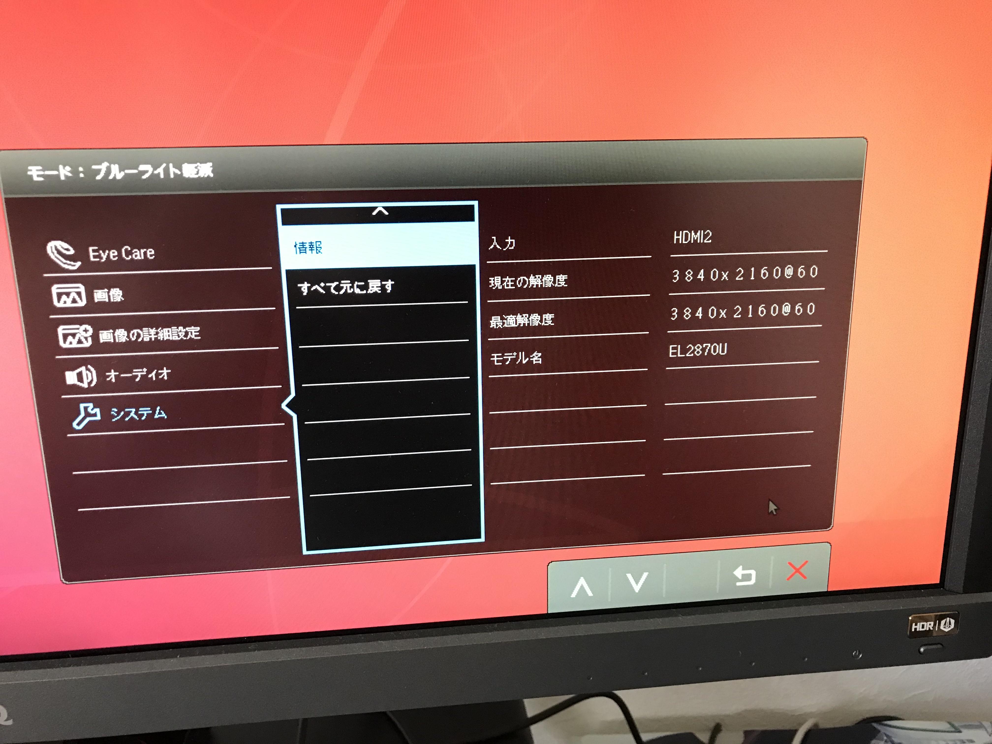 >>BenQのEL2870Uを接続したところ、4kかつ60Hzで表示ができました。