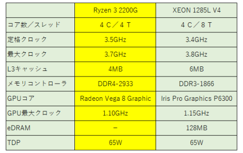 比較対象はIntel Xeon 1285L V4、内蔵グラフィック性能が強力なCPUです。