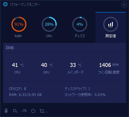 こちらは最大でCPU使用率が97%あたり、CPU温度も若干上がって40度でした。