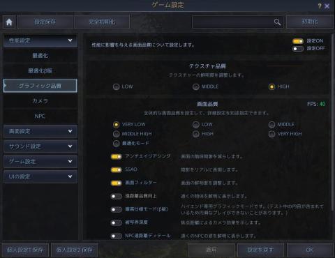 ちょっと見えにくいですが、上から最高品質43、高品質58、普通品質45、低品質58と誤差程度のFPS値ですがほとんど差がありませんでした。