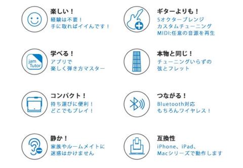 Zivix社から発売されたjamstik+ ギターは、AppleデバイスやAndroidデバイスにBluetoothでワイヤレス接続し、本物のギターと同様の弦(スチール)とフレットによって、接続したスマホやタブレットデバイスの音源ををつかって音を鳴らして初心者からプロまで誰もがギターの演奏ギターの練習・演奏を可能にするポータブルスマートギターです