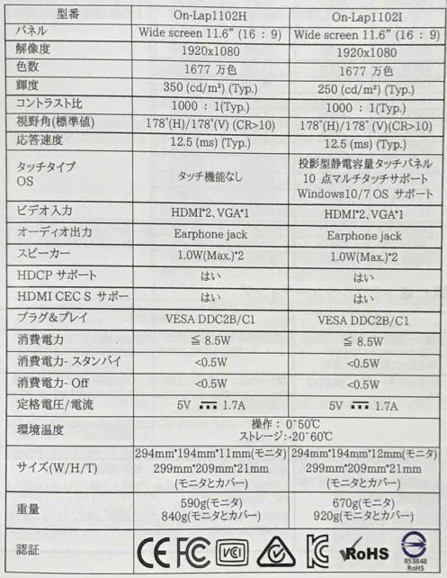 その他の違いはパネルの輝度が On-Lap 1102H V2 は350(cd/m²)で 1102L は 250(cd/m²)と違うところ以外はほぼほぼ性能は一緒のようです