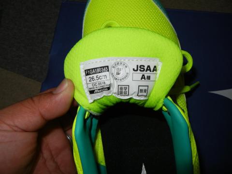内部には、このミズノ プロテクティブスニーカー オールマイティ VSに与えられている検定の種類(耐衝撃と耐滑)が製品の形名とサイズ等と共に表示されています。