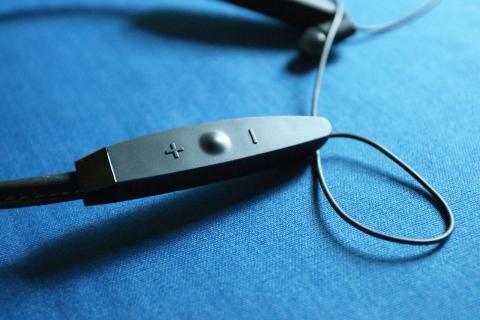こちらはリモコンです。中央の突起が再生/停止、+とーは曲送りとボリューム増減を兼ねたボタンとなっています。電話機のヘッドセットとして利用した場合には、通話切断等もここでコントロールします。