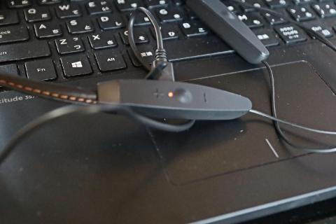 この写真ではオレンジ色のように見えてしまいますが、実際には充電時はLEDが赤く点灯します。もっとも、出荷時点で概ね充電されているようで、DELL Latitude15 3570のUSB端子でも10分程度経過して確認したところ消灯していました。