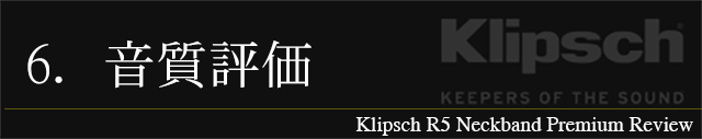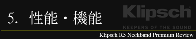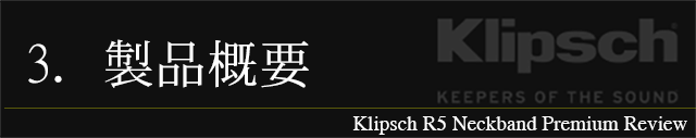 公式の製品紹介によると、上位のR6 NeckbandにはKlipsch独自の型番を与えられた(ドライバー製造元に特注仕様でオーダーしていることを表します)ダイナミックドライバーが搭載されているのですが、このR5 Neckbandはドライバーの型番が公開されていません。ただ、5.0mm径のダイナミック型ドライバー(5.0mmはダイナミック型としては小型であり、他製品では8~10mm位の口径のものが多くなっています)を搭載していて、周波数特性が10~19kHzであることが判るだけです。